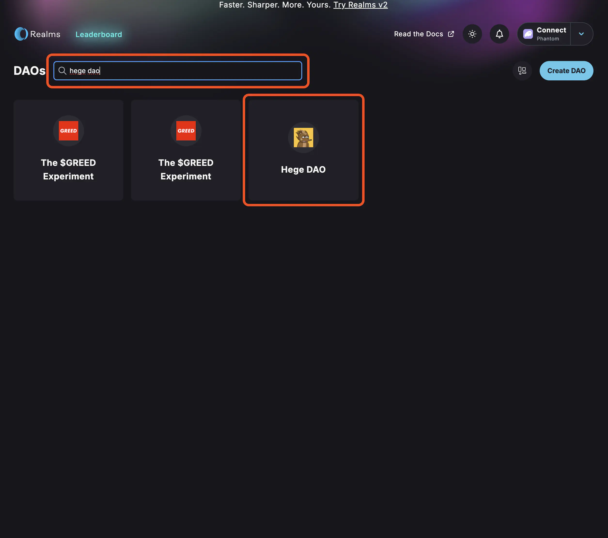 1. Search for “hege dao”. Then click “Hege DAO” in the search results.