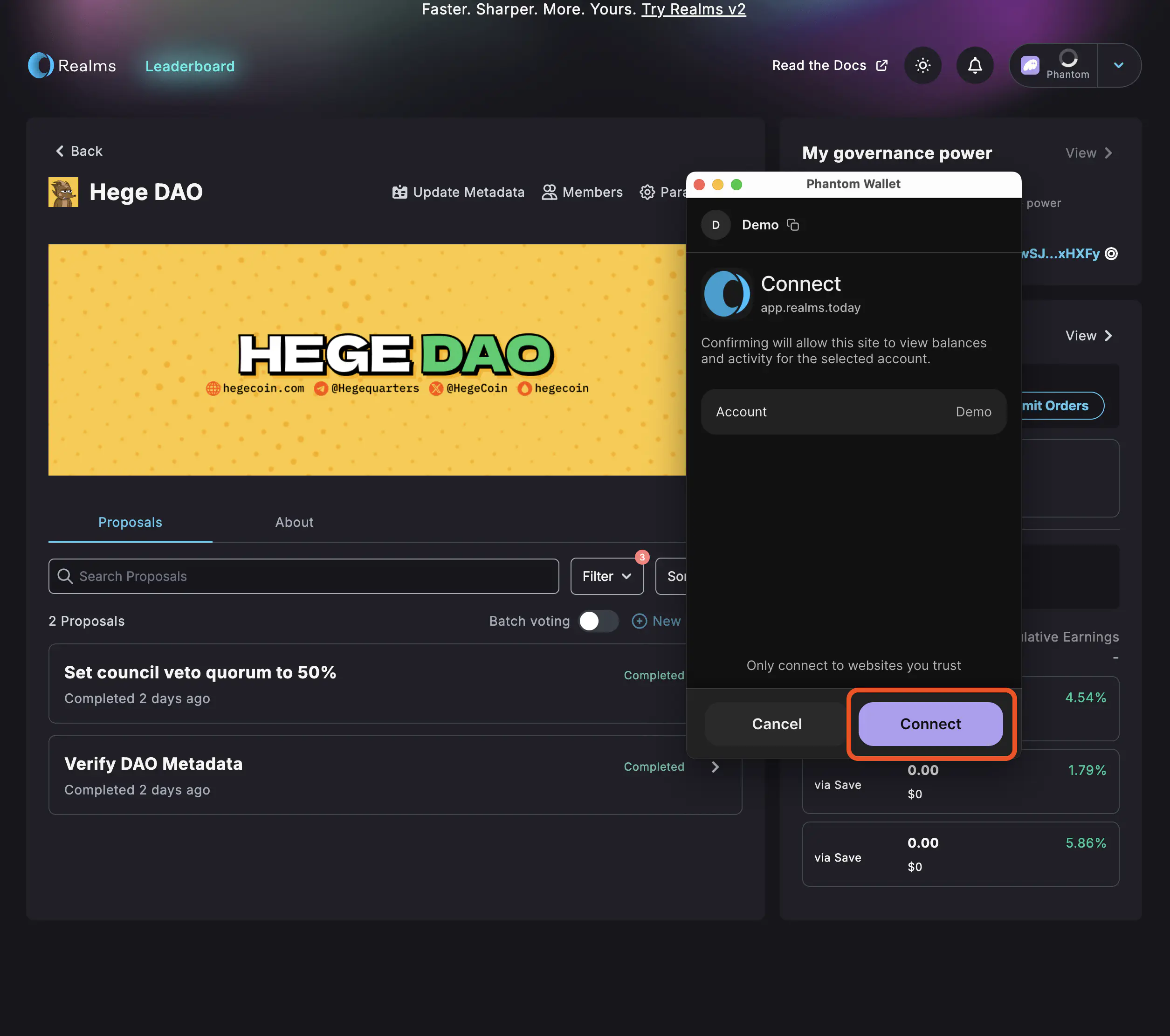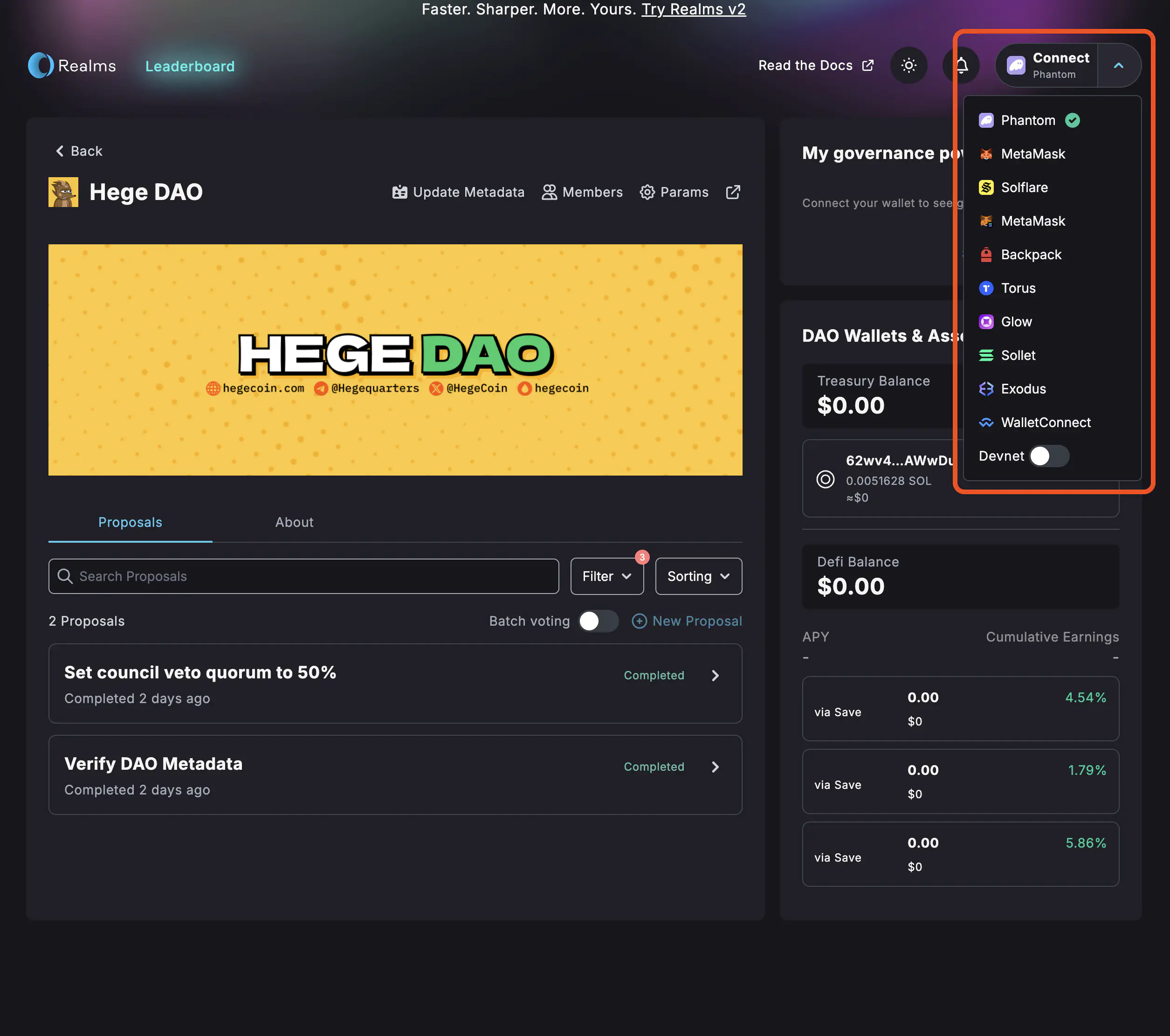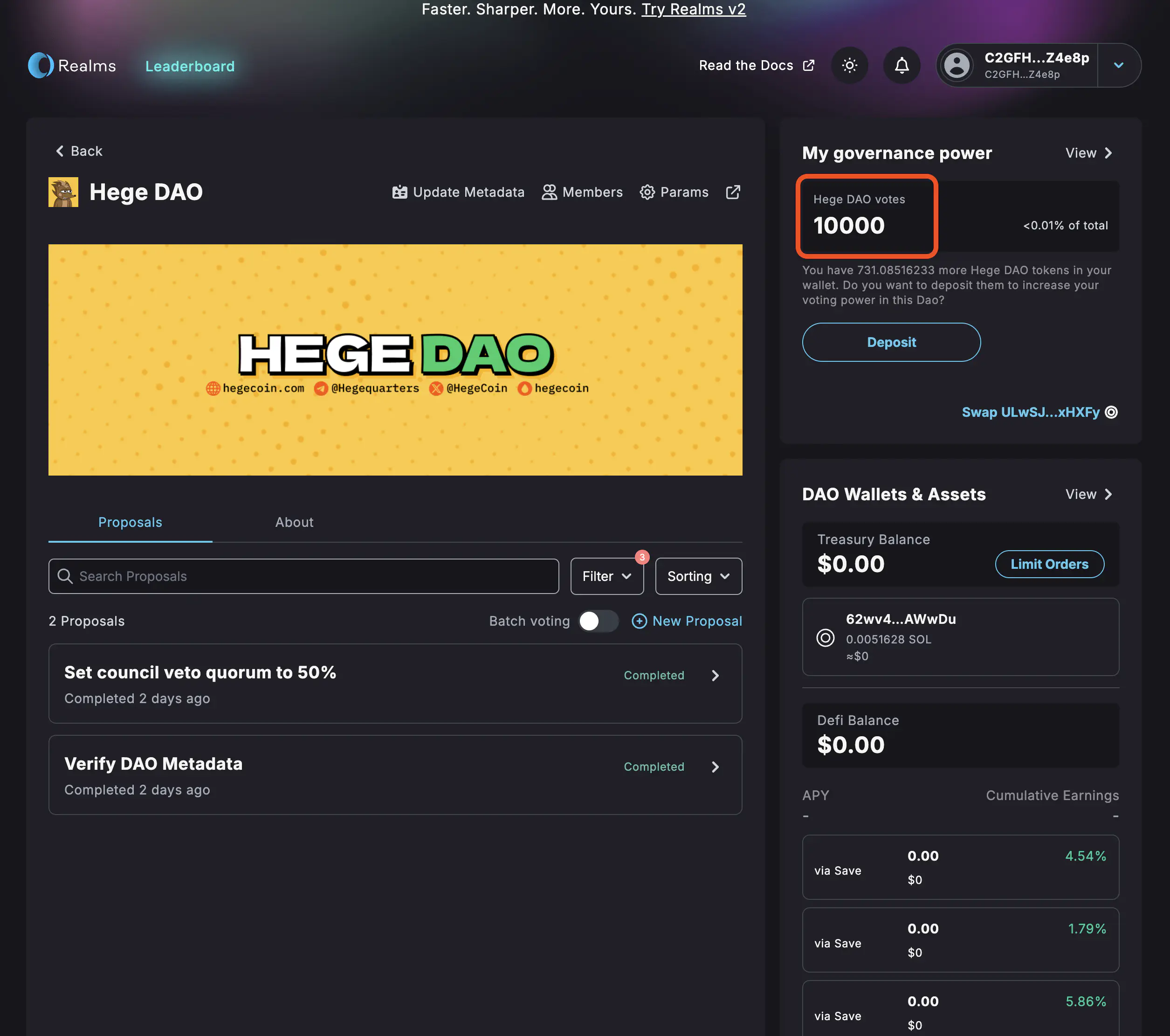 Under the hood, the Hege DAO is hosted on the Realms platform. This is a user-friendly interface to the Solana on-chain SPL Governance program. This system has been audited, and is trusted by the biggest names in the Solana ecosystem, like Jito, Metaplex, Pyth, Bonk, and many more.
