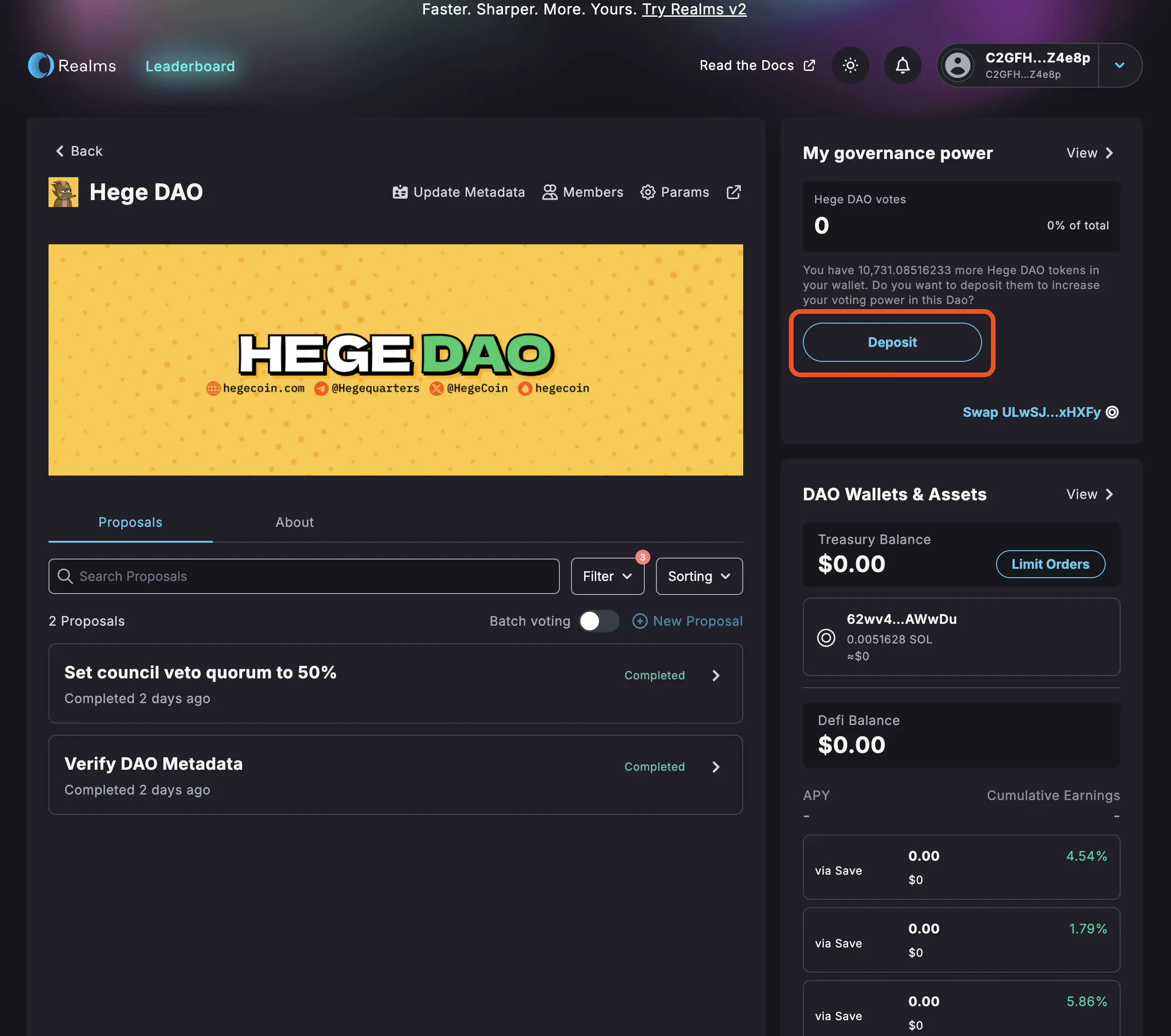 For your first deposit into the Hege DAO, you are going to use the old version of the Realms UI. Why is that? It’s because in their new UI, they charge 0.1 SOL for your initial deposit. But you can get around that by using the old one, where deposits are free. After your first deposit, you can then use the new UI with no extra costs.