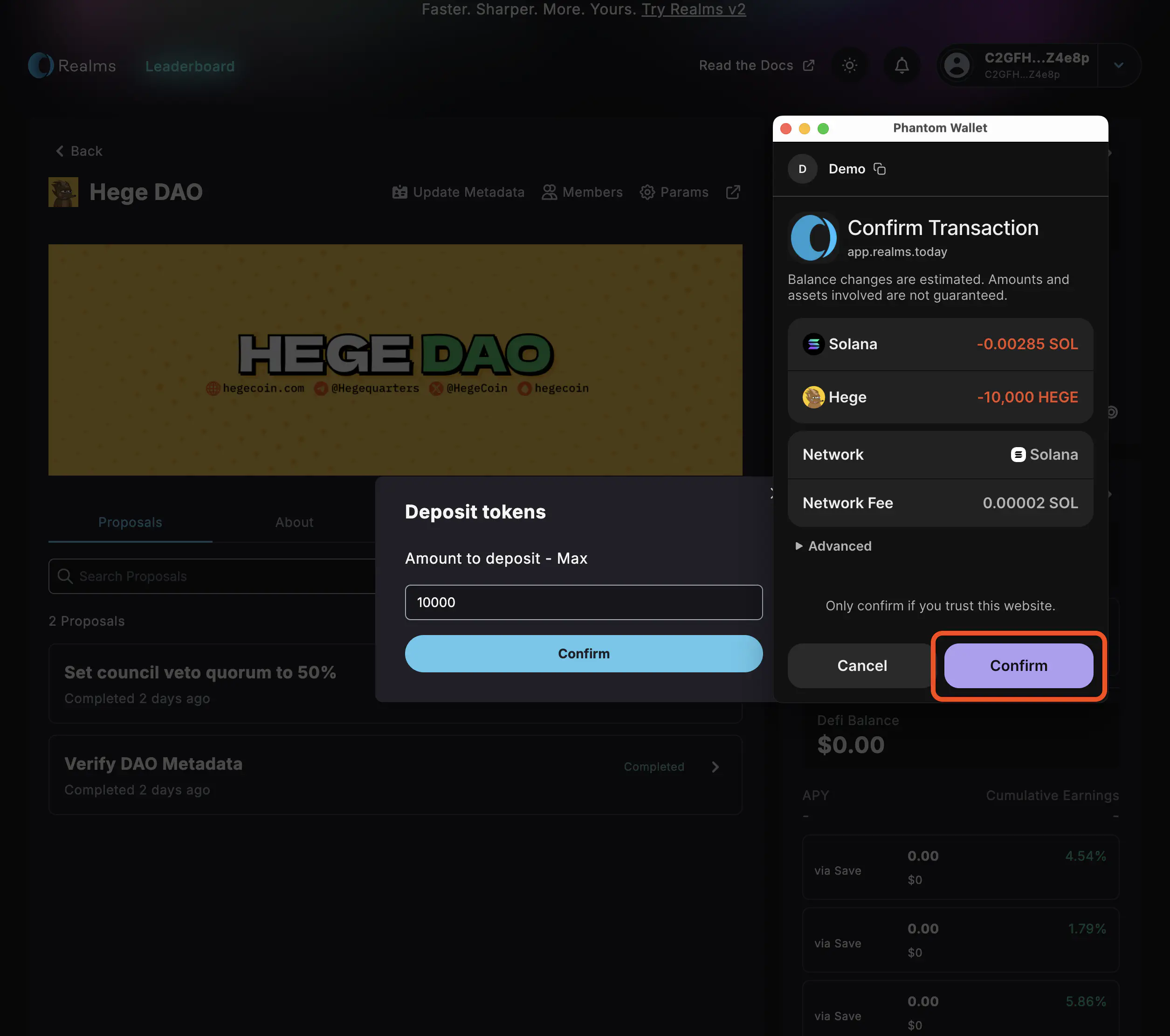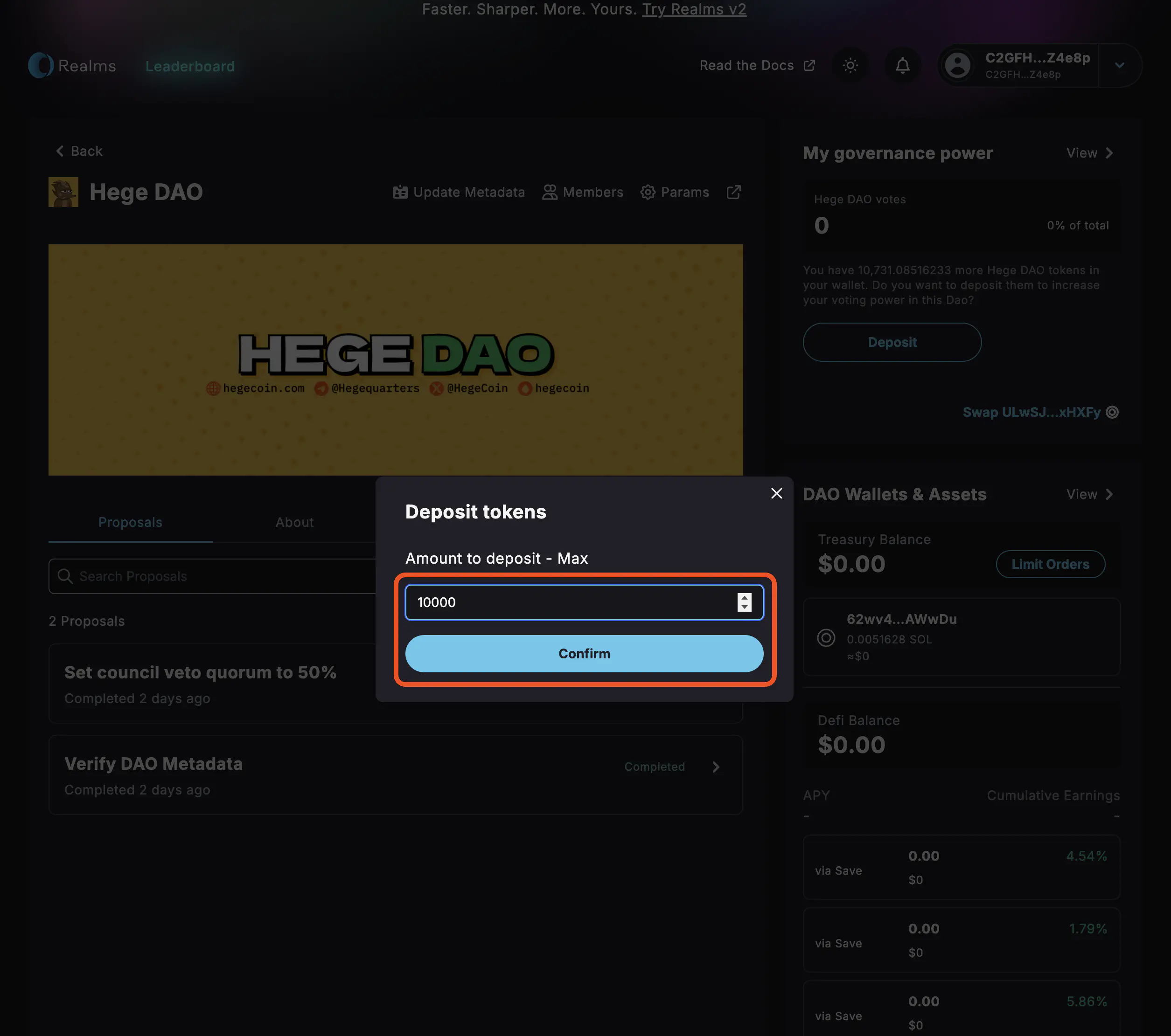 1. Select how much $HEGE to deposit and click “Confirm”. (NOTE: You need to deposit at least 10,000 $HEGE to be able to create a proposal, should you want to.)
