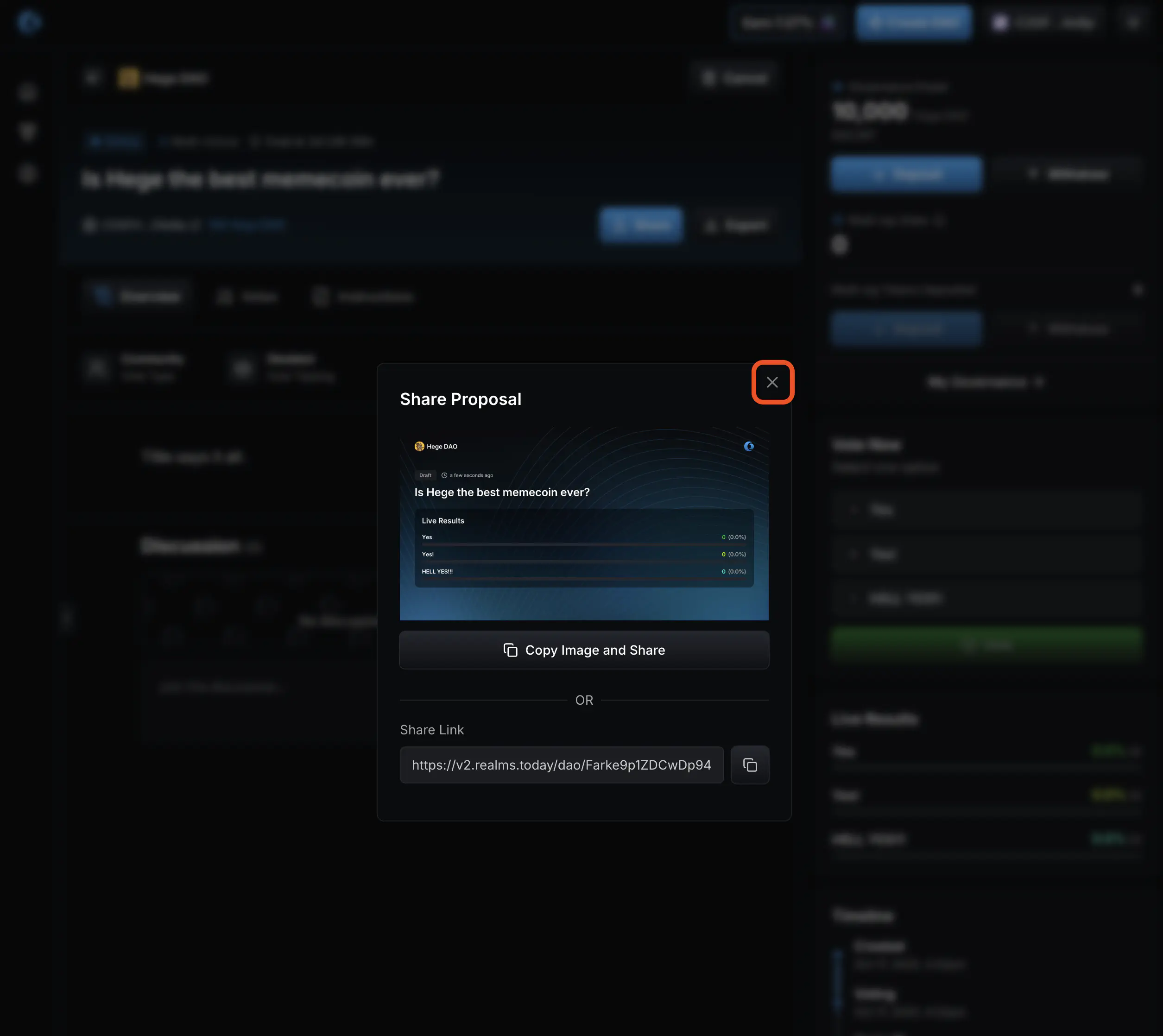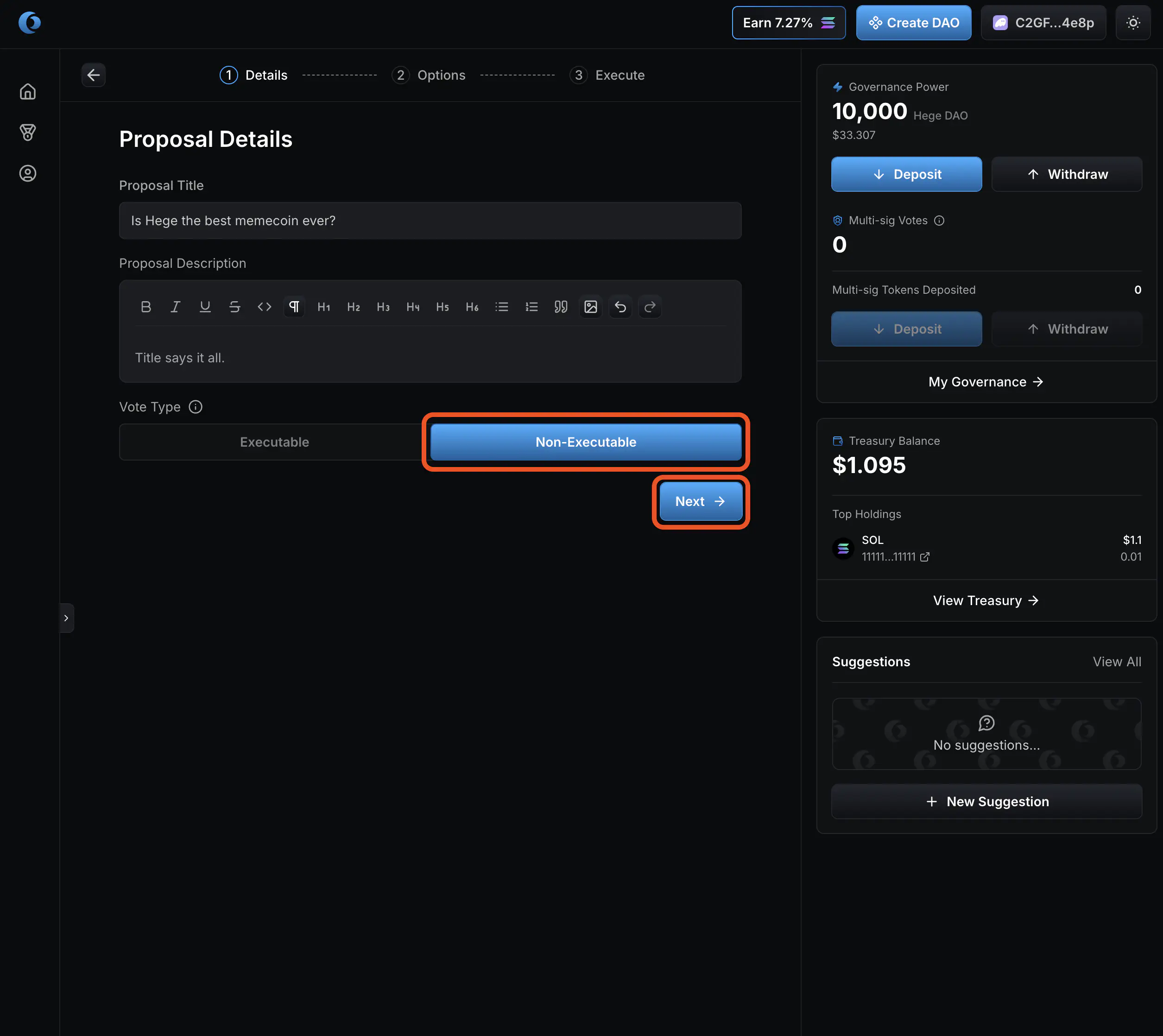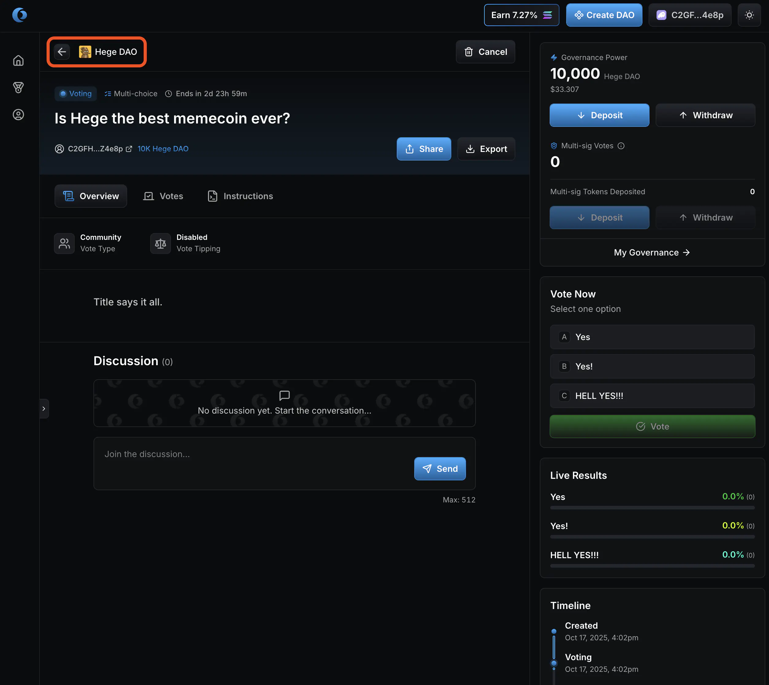- That’s it! Your proposal is created and open for voting. Now go share it with the Hege community! And don’t forget to vote on your proposal. See How to Vote in the Hege DAO if you need help with that.