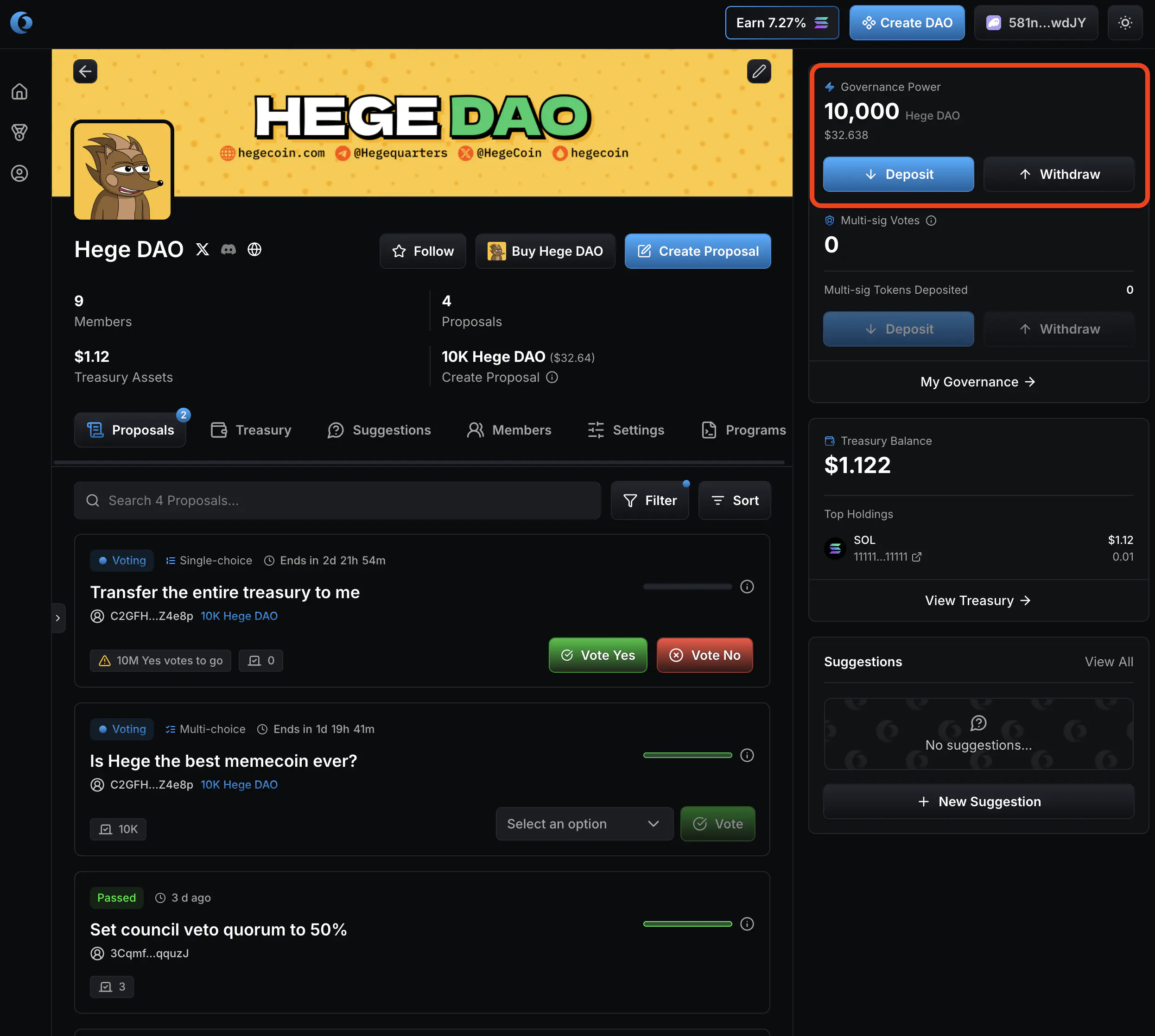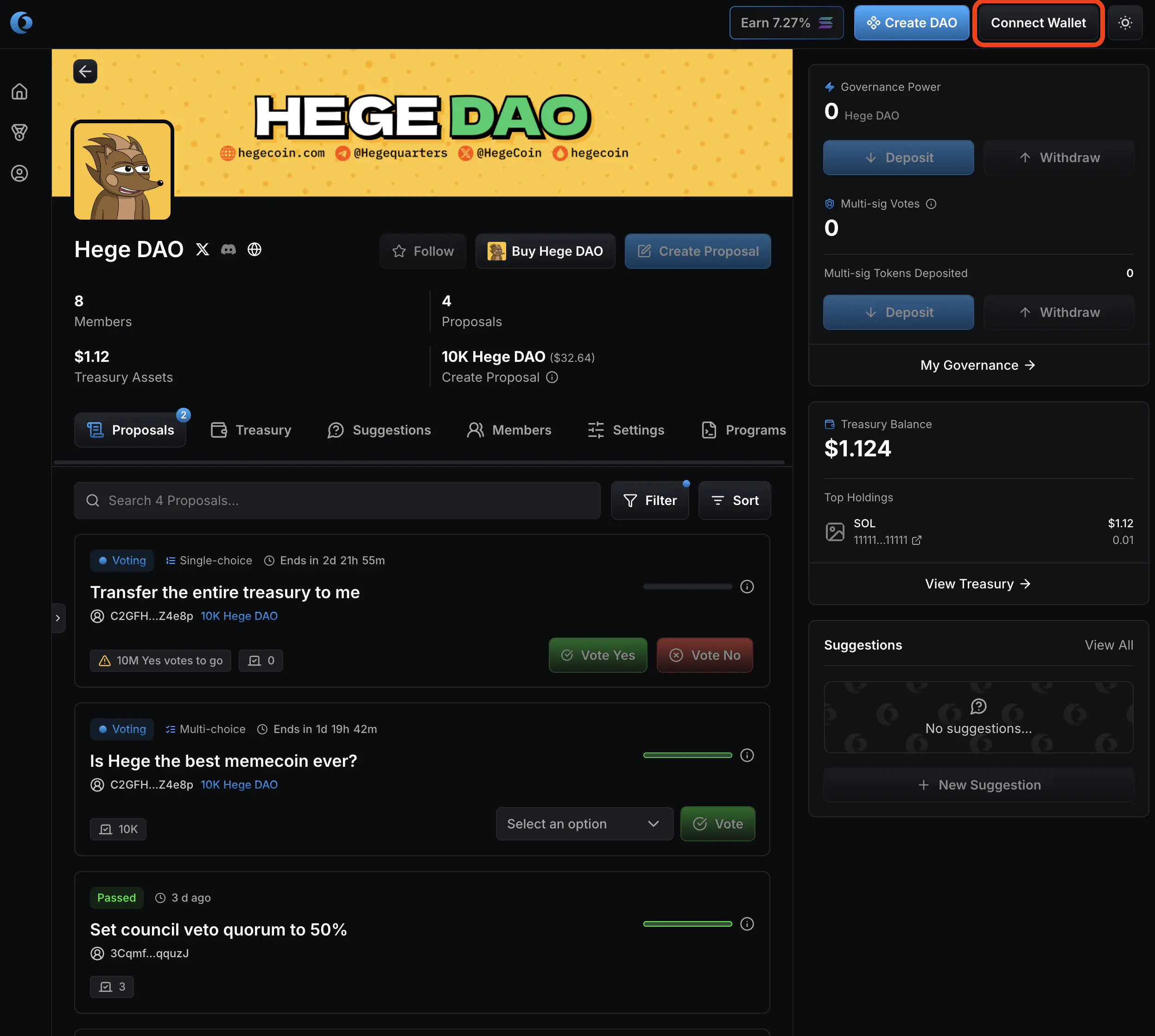 - Go to the Hege DAO page on Realms. It should look something like this. Click “Connect Wallet” to connect your wallet.
