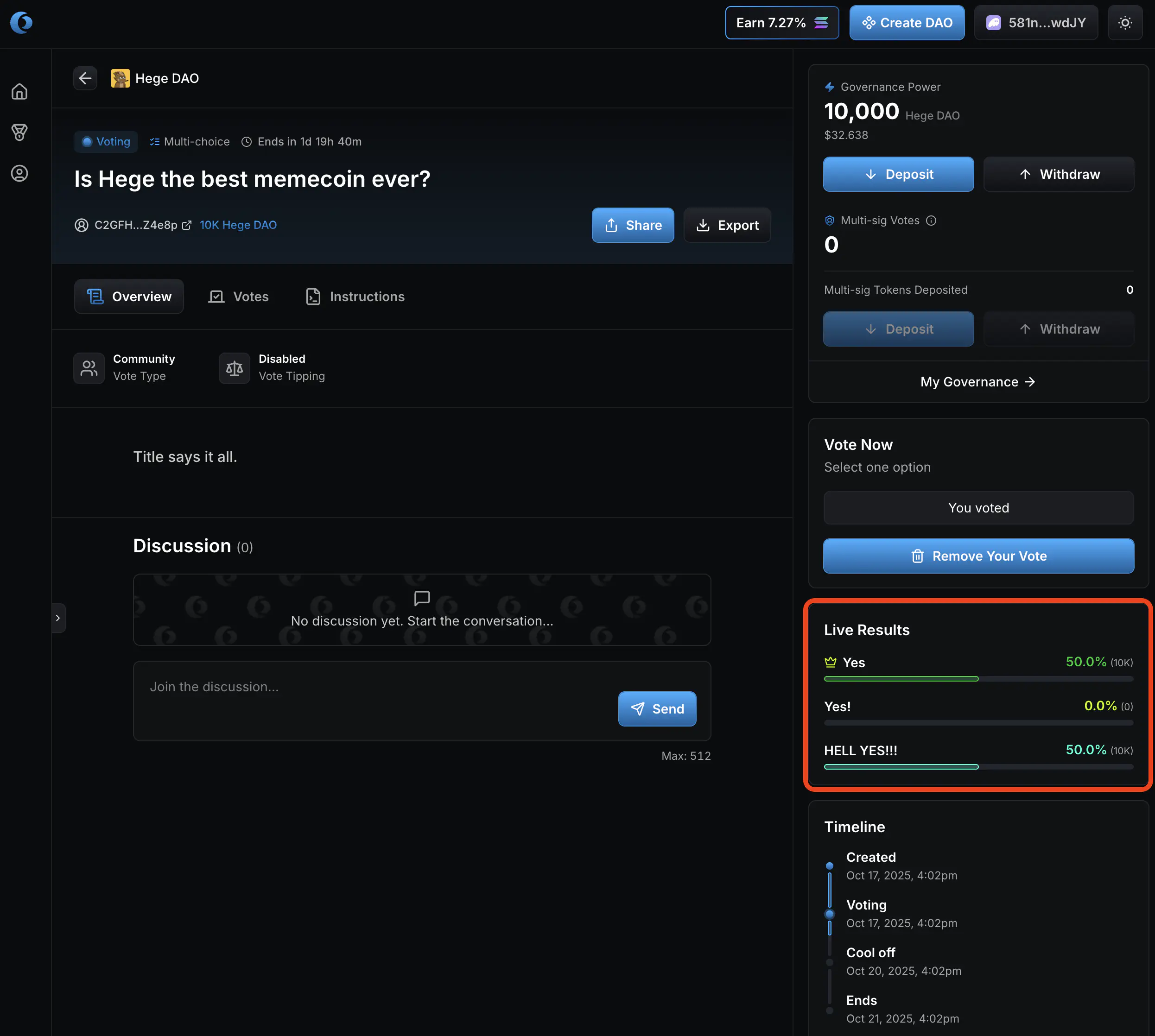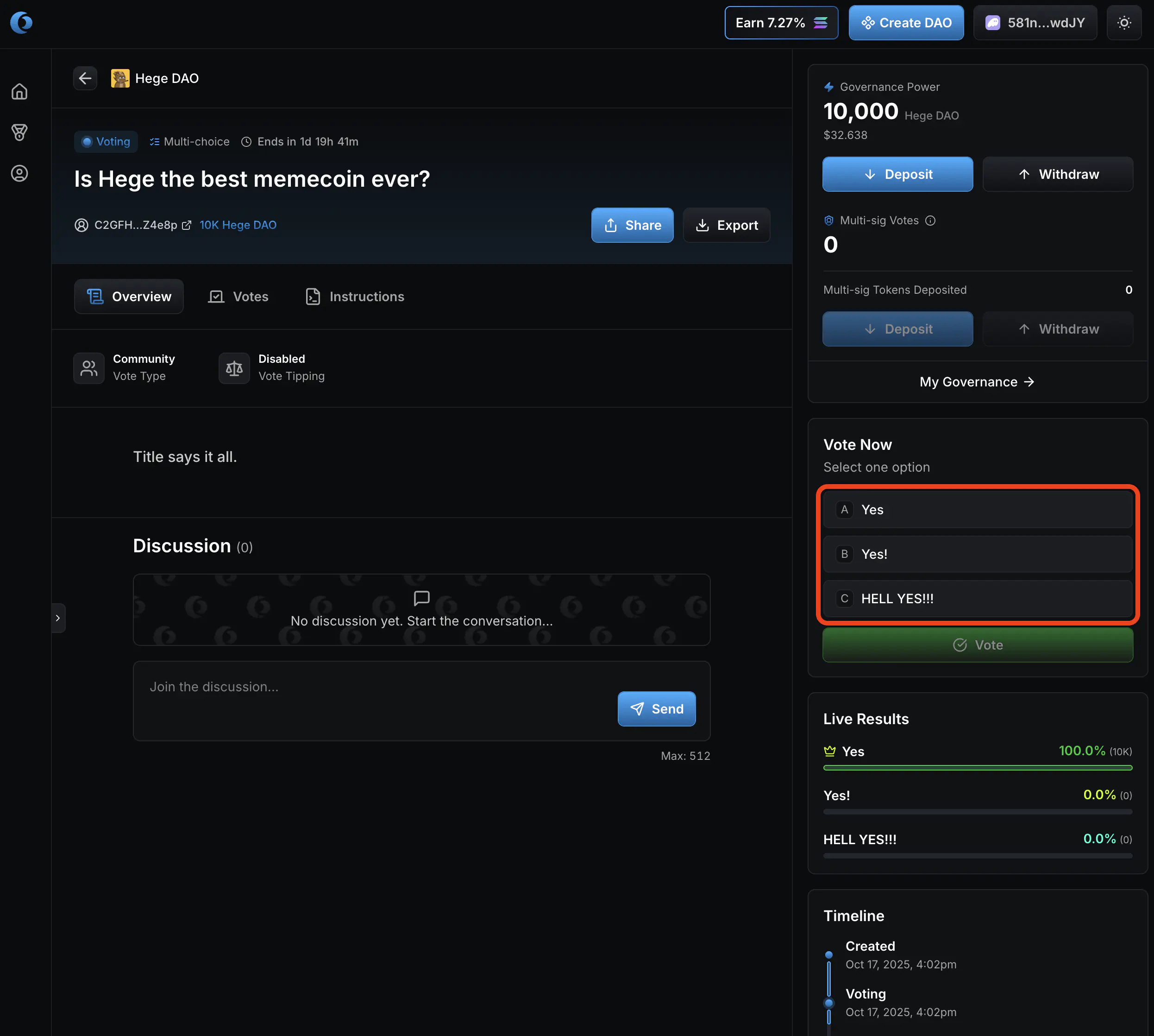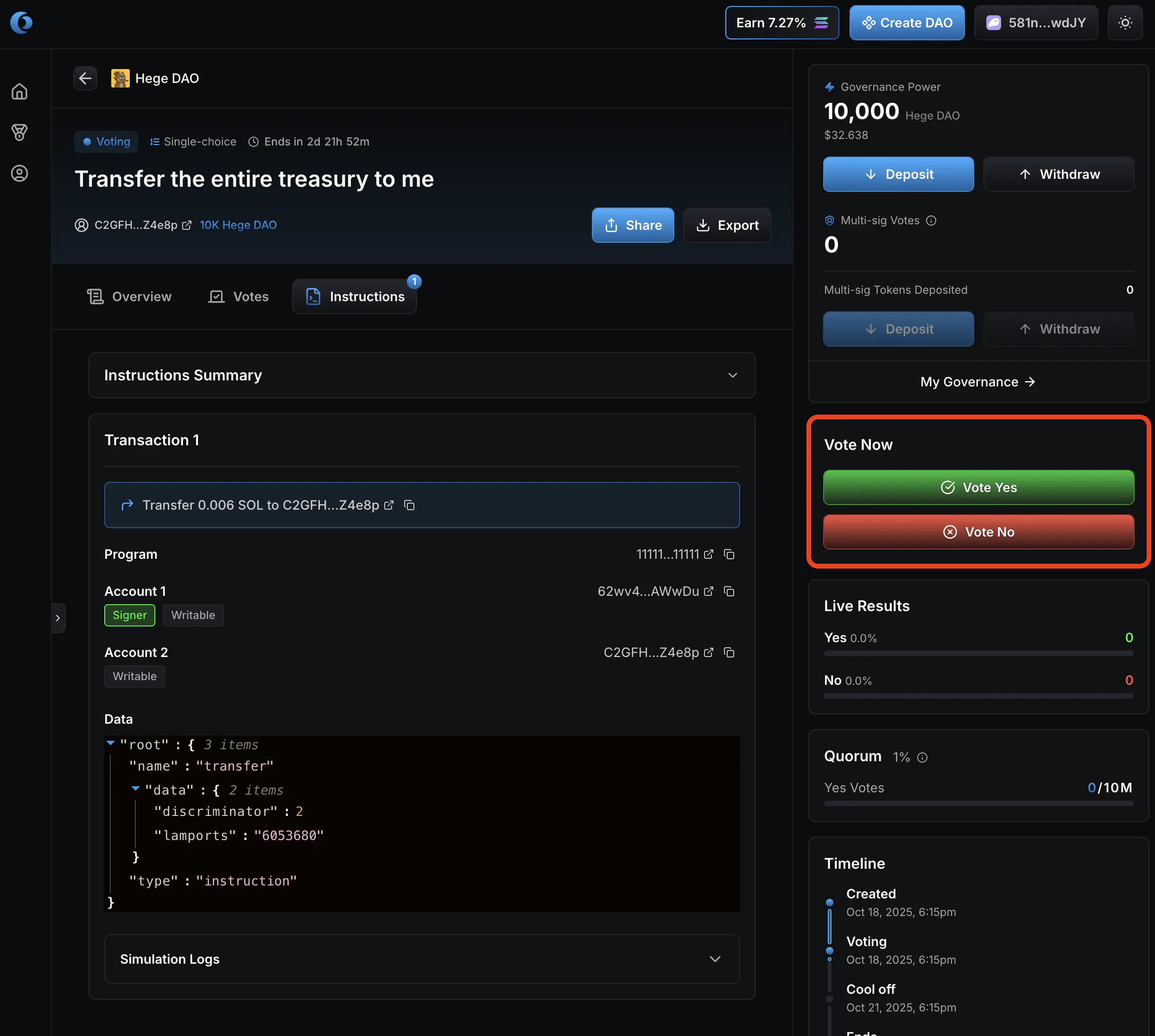 - You have now voted! Once the vote has confirmed on the Solana blockchain, the voting results will update to reflect your vote.