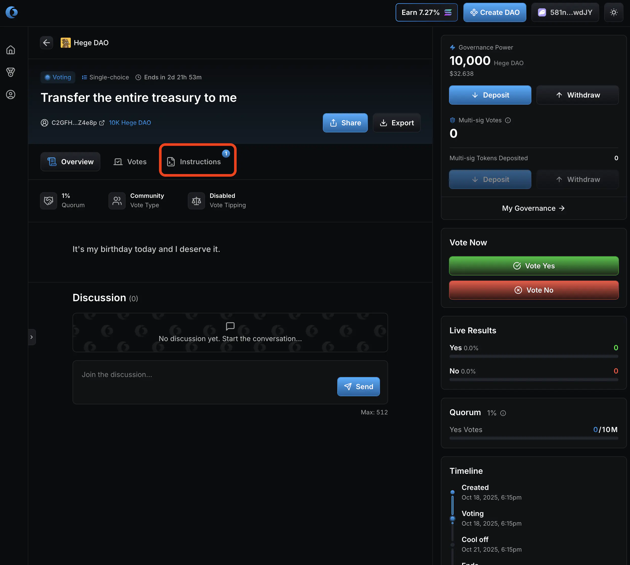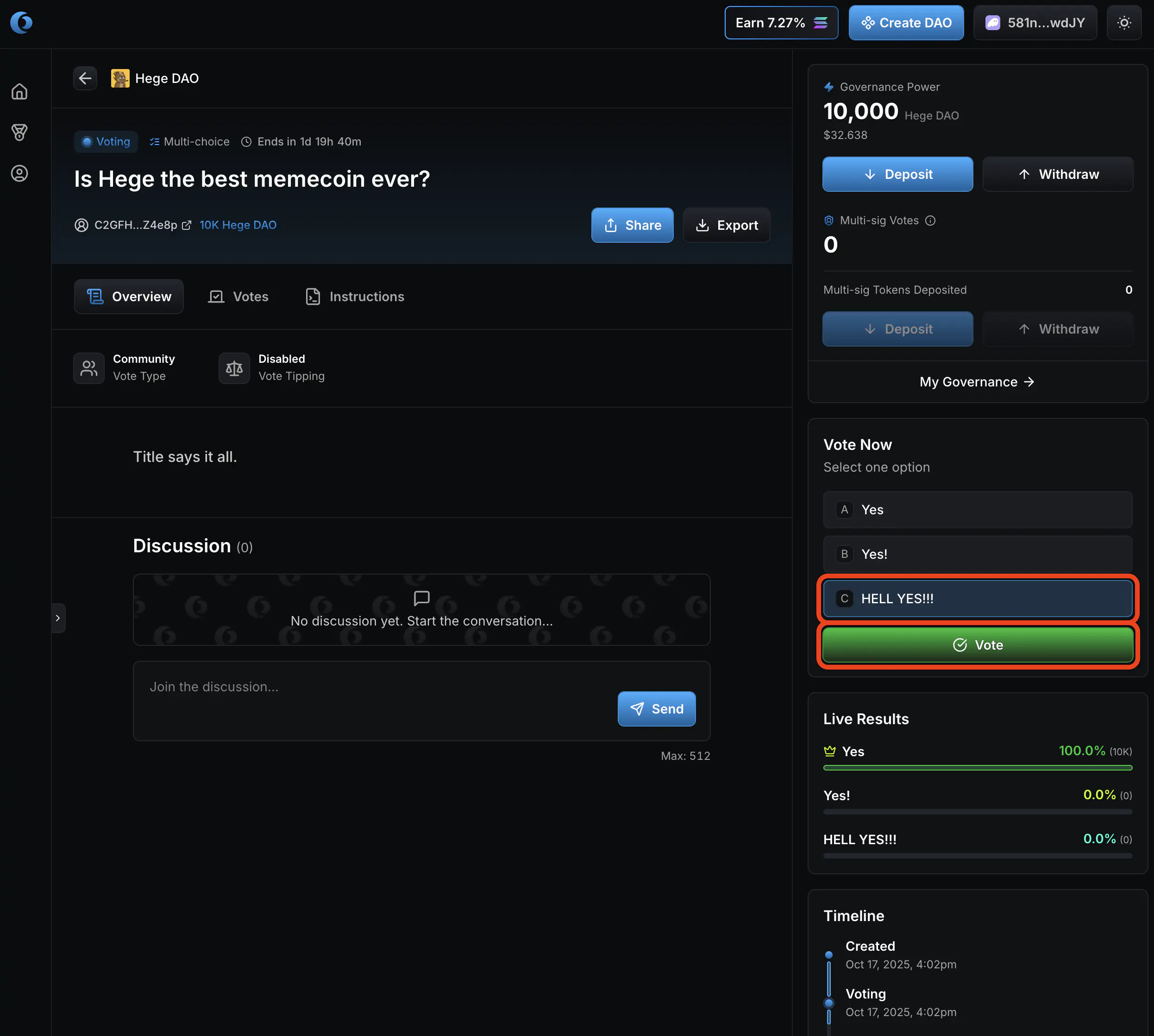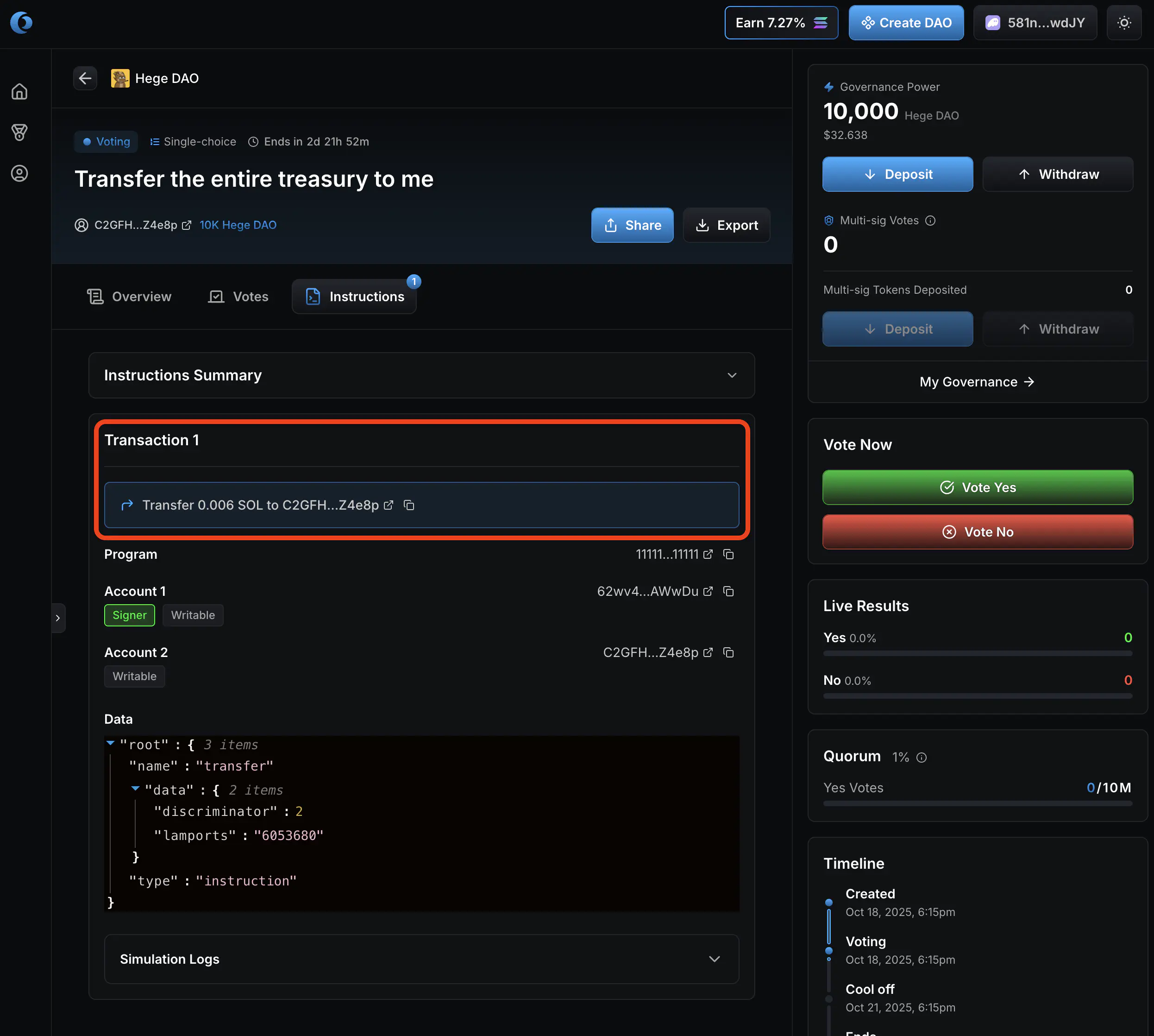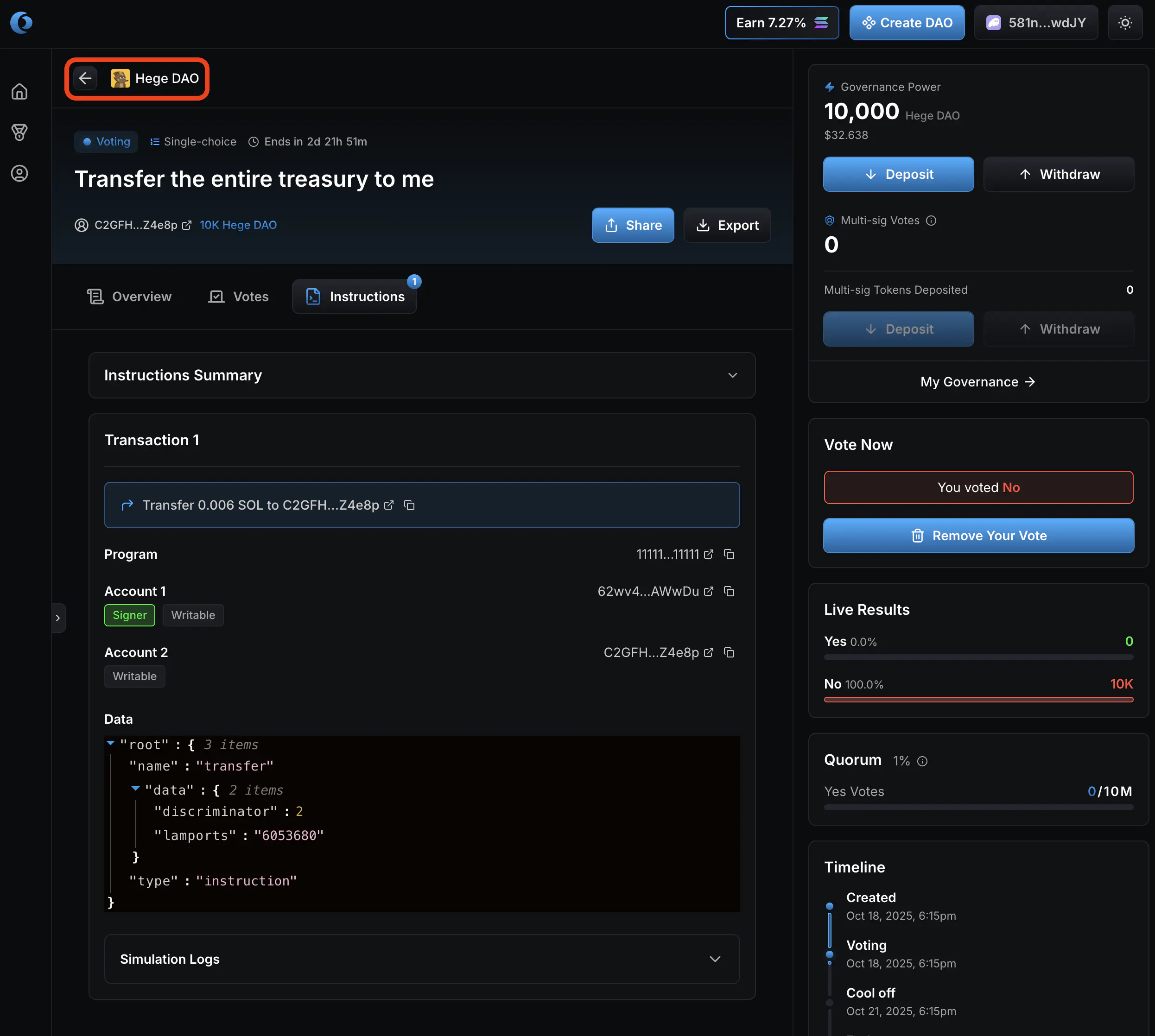 - Now it’s up to you as a member of the Hege DAO to judge if you think these funds should be spend or not, and vote accordingly. Click “Vote Yes” if you approve the transfer of the funds. Otherwise click “Vote No”.
