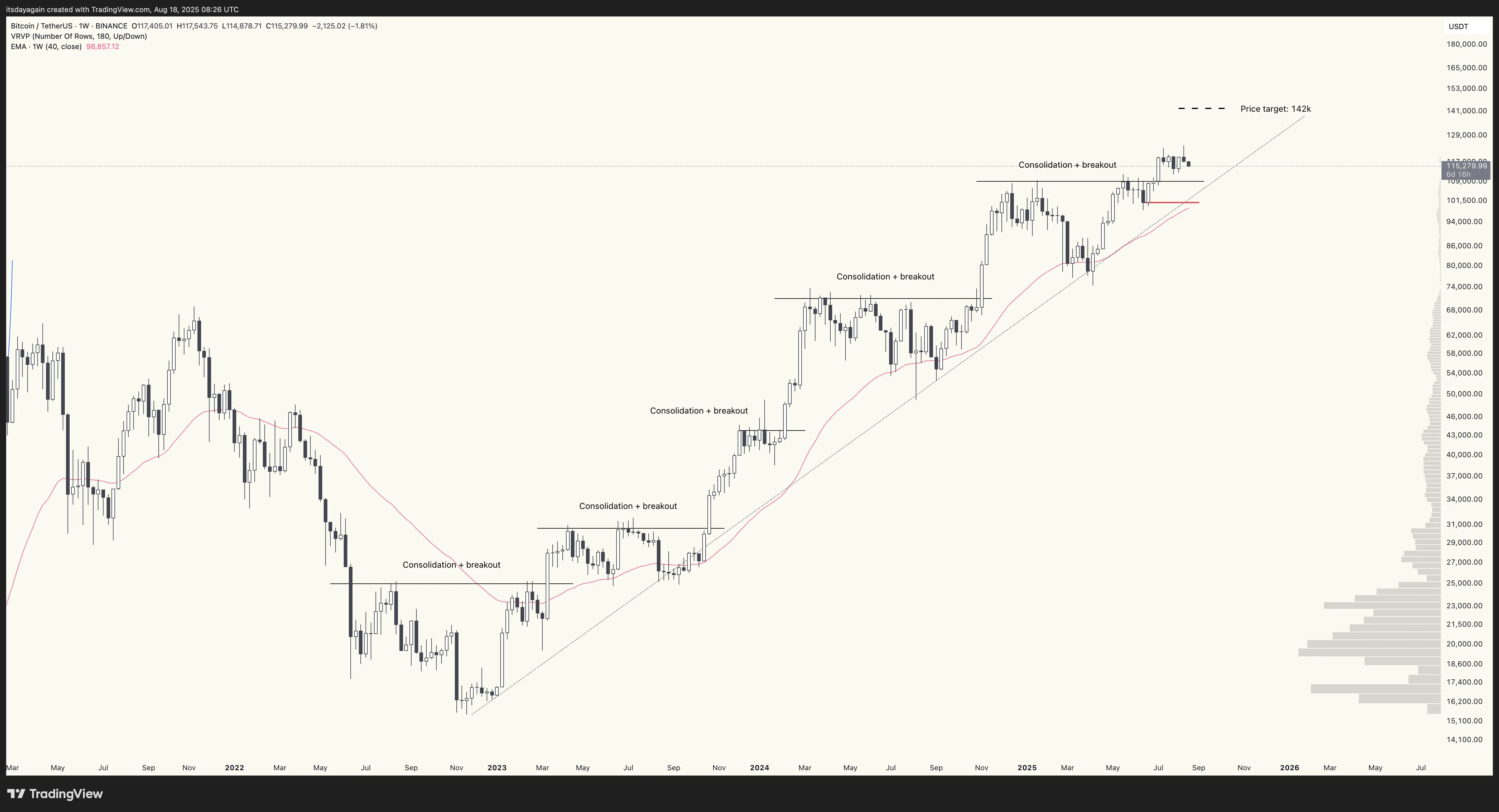 Taking a step back though, the weekly bitcoin chart is still bullish, spending another week consolidating after the breakout back in early July. The breakout is still intact, with a price target of 142k.