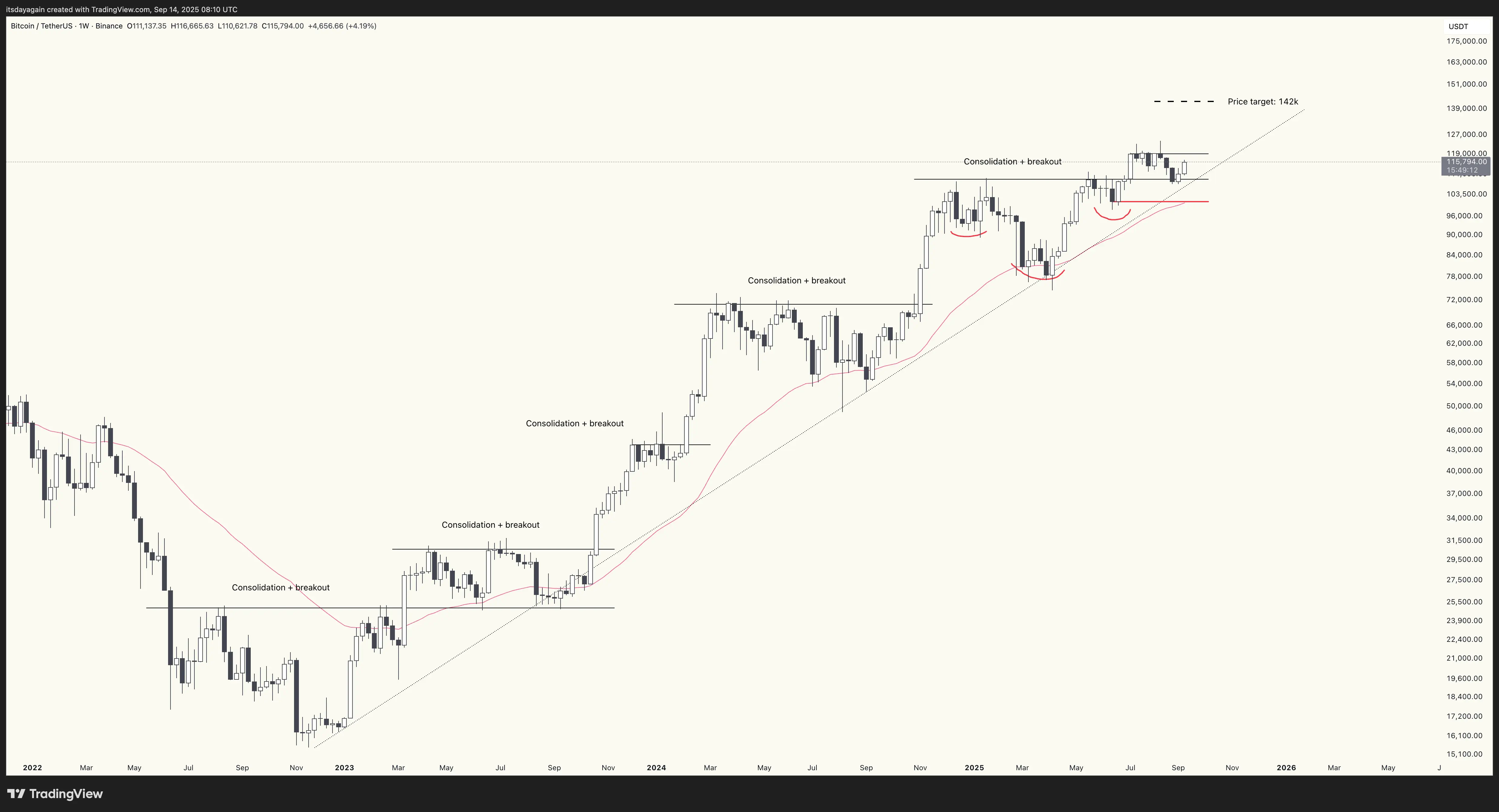 BTC/USD weekly chart, 14 September 2025. Bounced from $109k. Price target of $142k remains.