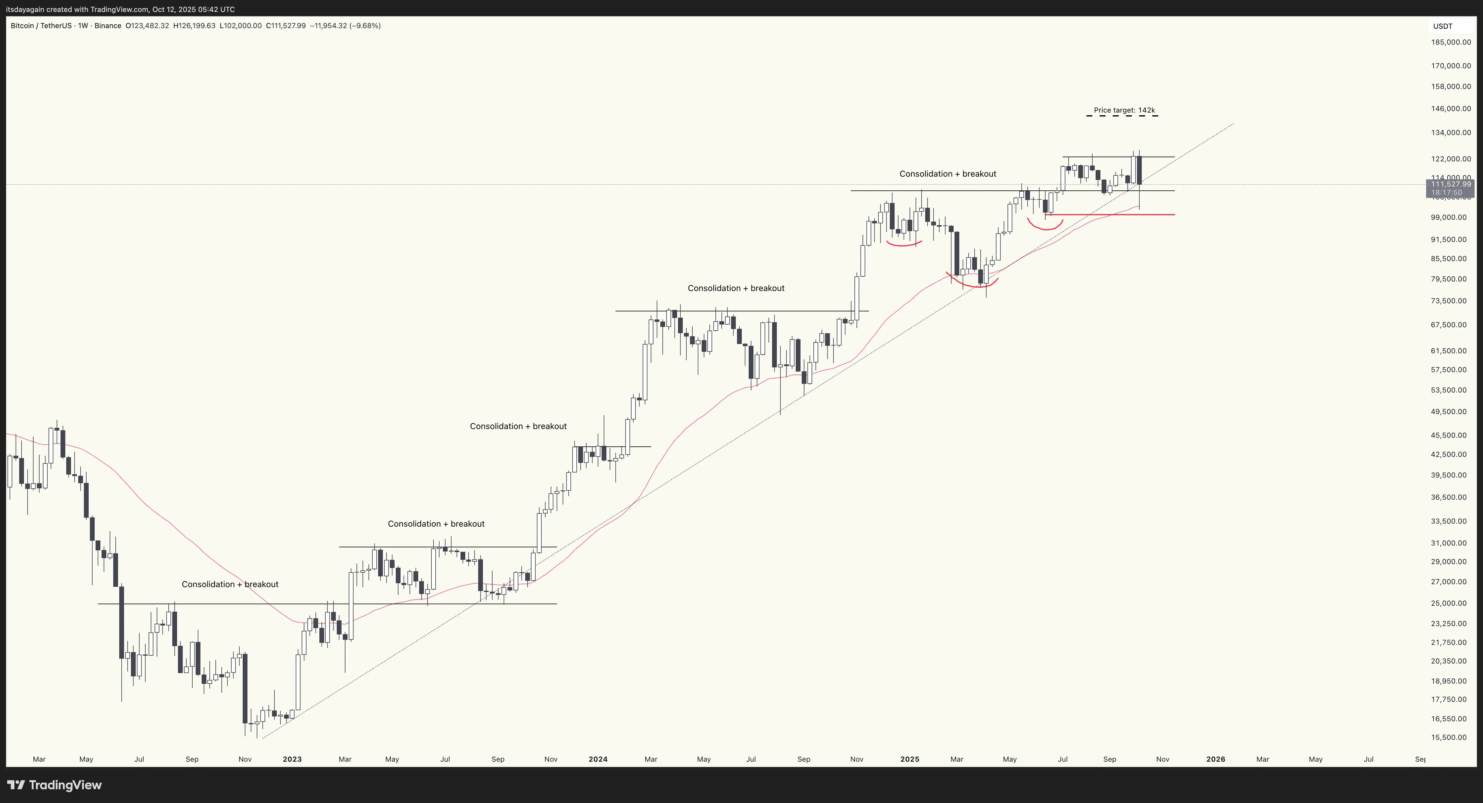 Despite the chaos, BTC held up relatively well. On some exchanges it dipped all the way down to $100k, but then soon recovered up above the old support level at $109k. The week has not closed yet, but it looks likely it will close above $109k, with the support level intact, and the price target of $142k remaining for yet another week. As dramatic as Friday was, the bitcoin chart still holds up.
