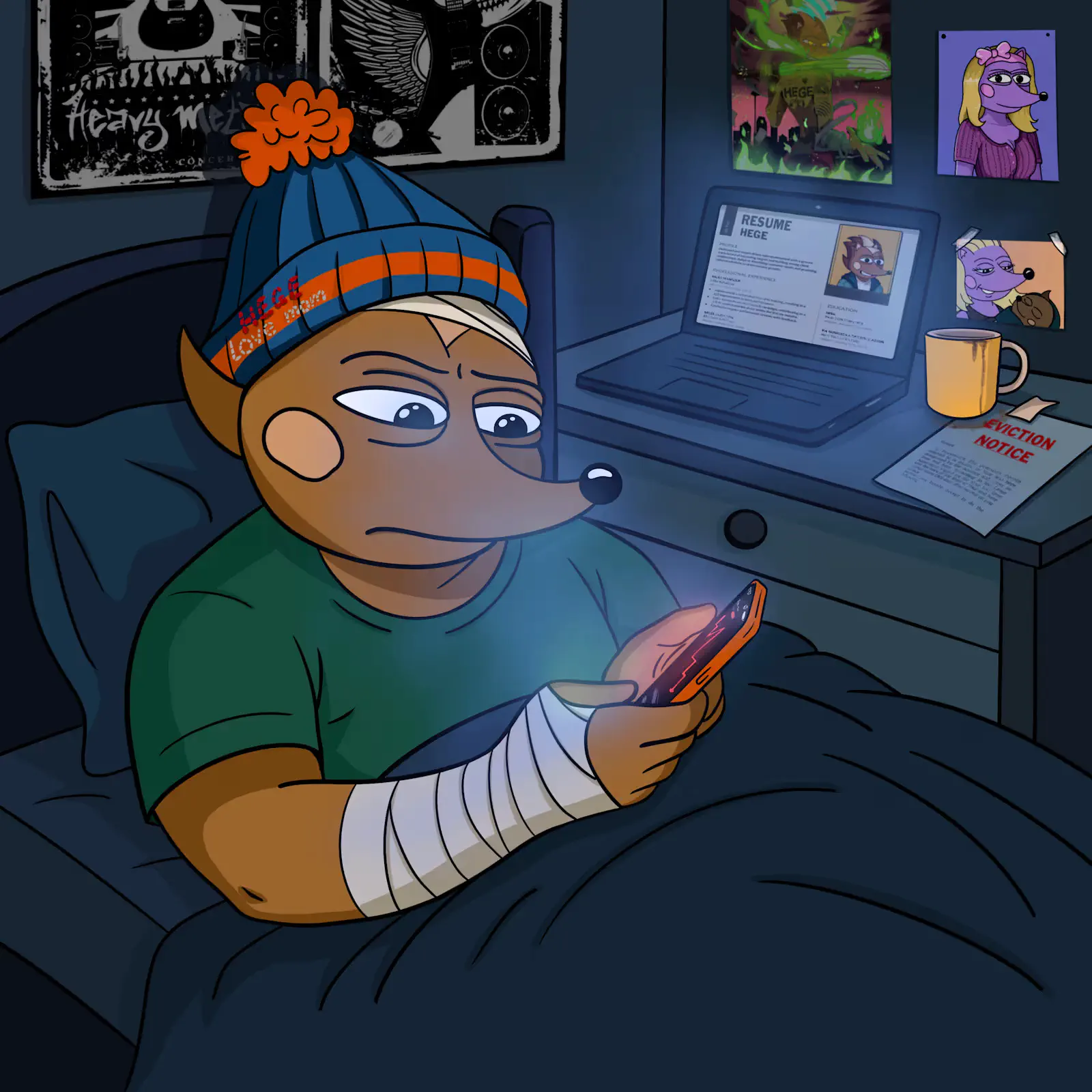 Late at night, injuries wrapped and eviction notice looming, Hege doom-scrolls crypto charts. Bandaged but not broken, he clings to memories of his mum and the belief he can still turn it around.