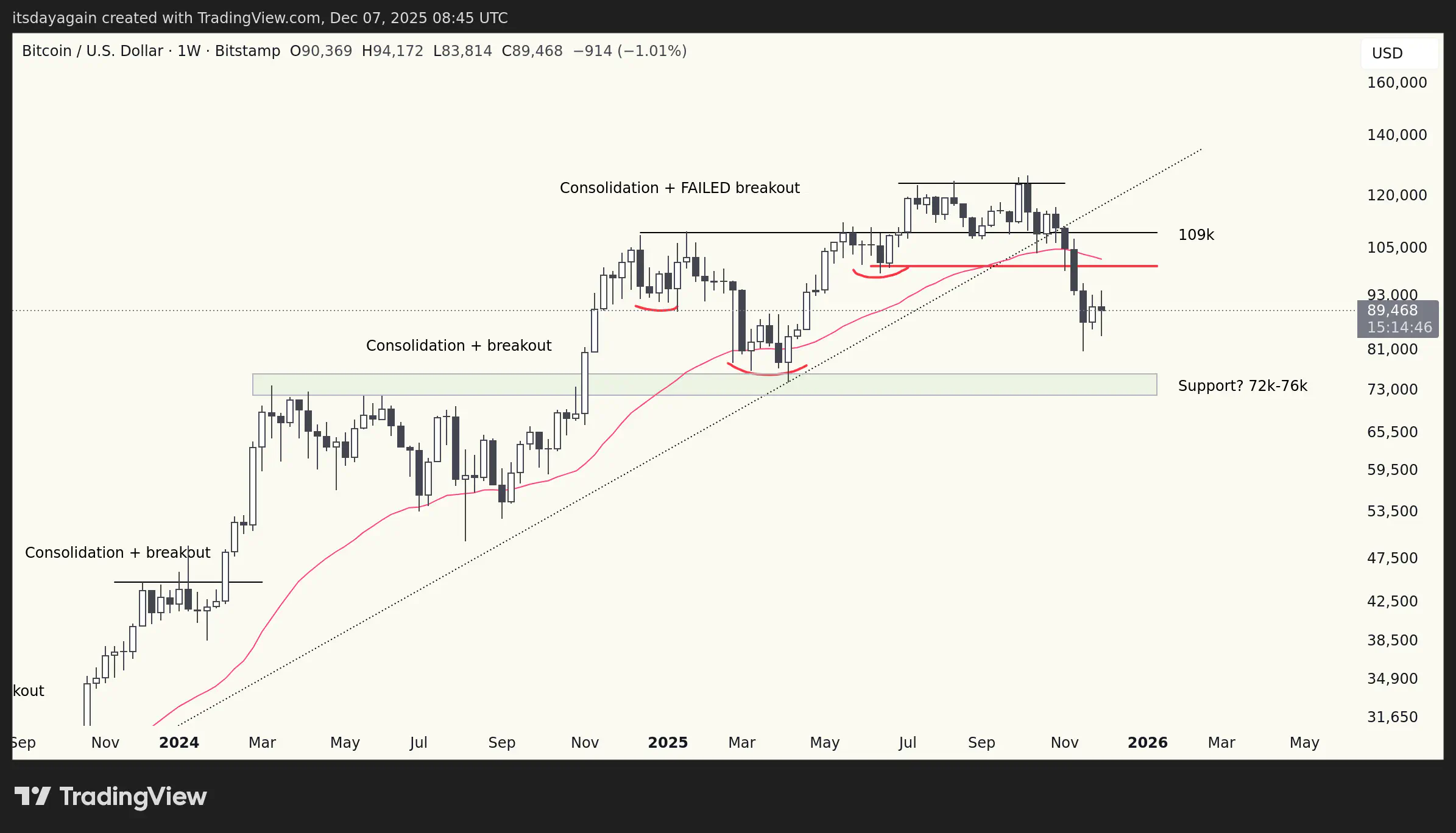 BTC/USD weekly chart, 7 December 2025. Bouncing from $81k. Resistance at $100k and $109k.